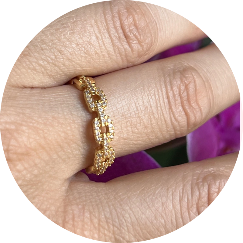 Anello a catena, in acciaio inossidabile, regolabile, con tanti piccoli punti luce che lo rendono luminosissimo! Disponibile in gold color e silver color.