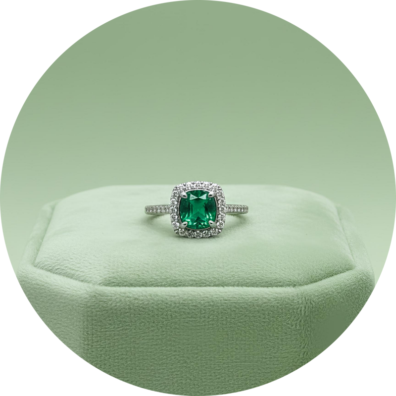 Pietra: Smeraldo coltivato in laboratorio, round cut.