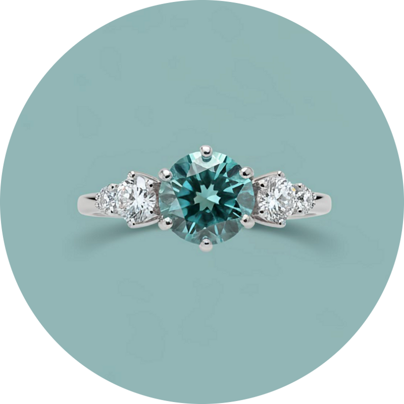 Il colore azzurro è valorizzato da due zirconi laterali, che aggiungono luce e creano un equilibrio raffinato e armonioso.