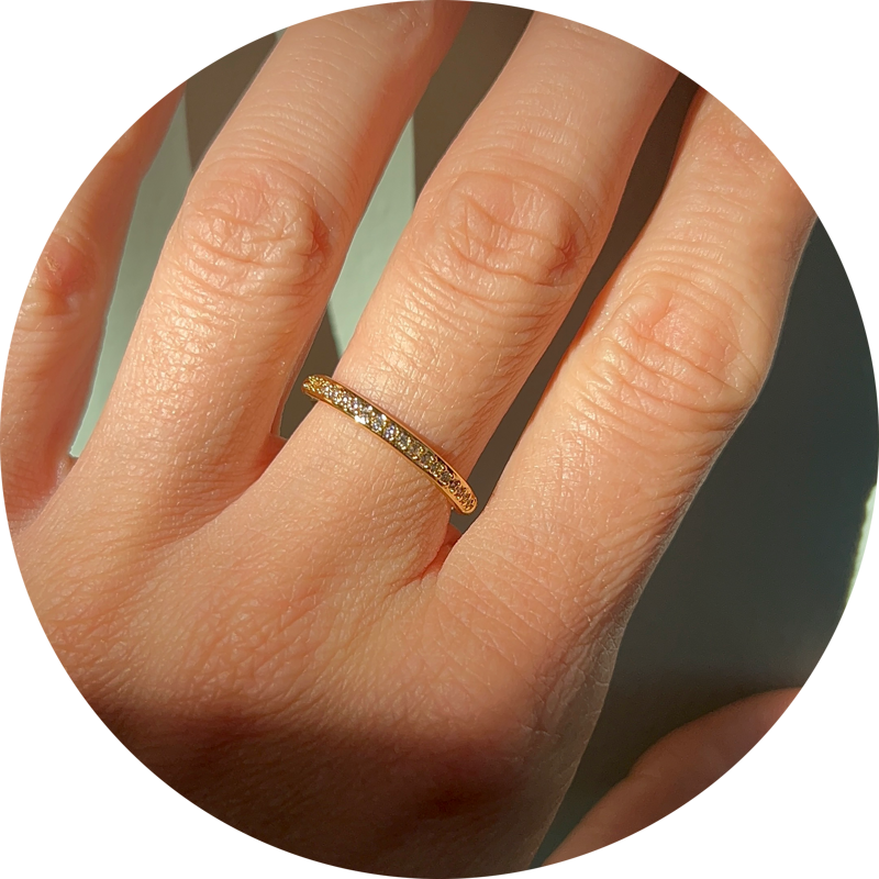 Aggiungi un punch di brillantezza alla tua collezione di anelli! Questo Minimal Luxe è l'anello perfetto per la tecnica dello stacking (sovrapposizione). La sua sottile linea d'oro e la brillante incastonatura a pavé creano un delicato sentiero luminoso al dito. Leggero e comodo, è un must-have che si abbina splendidamente sia a fedi semplici che ad anelli più vistosi. Eternity è regolabile per adattarsi a ogni dito.