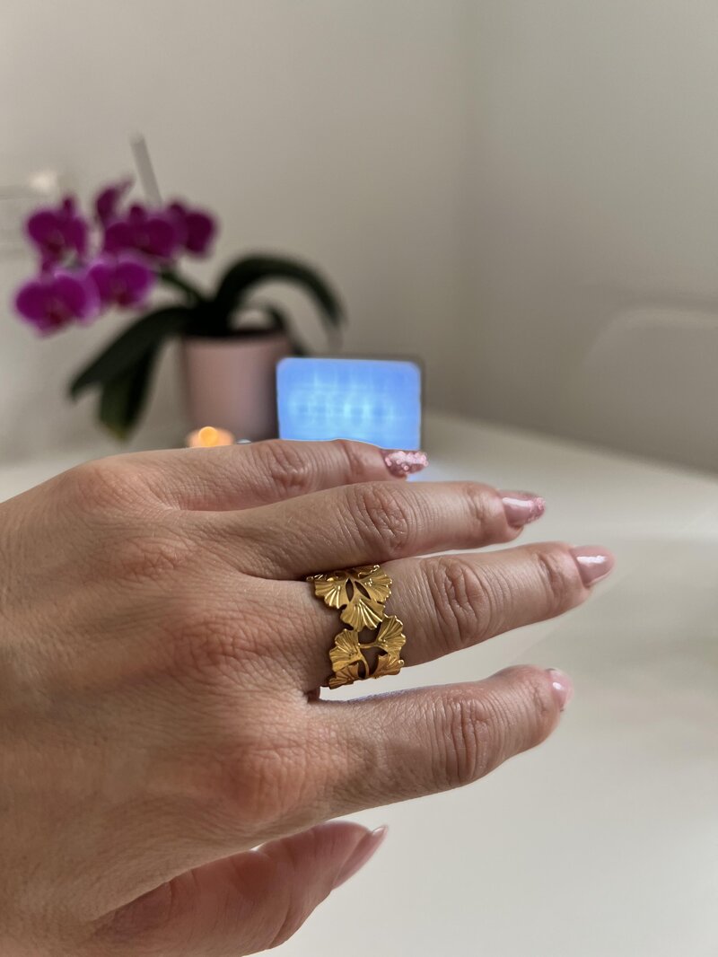 Anello in acciaio inossidabile, colore gold, regolabile. Elegante e moderno, il suo design con foglie di ginkgo biloba, simboleggia longevità, resilienza e rinascita. È un segno di forza, speranza e armonia, rappresentando la capacità di prosperare nel tempo.