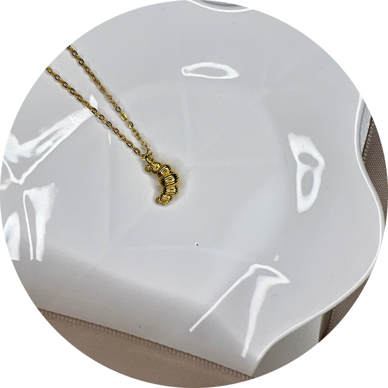 Porta sempre con te il simbolo della colazione perfetta con questa collana unica e raffinata. Il pendente, a forma di cornetto, è realizzato in acciaio al titanio dorato e naturale. Un piccolo gioiello che racchiude tutta la dolcezza di un momento speciale. Leggera e versatile, è l'accessorio ideale per chi ama distinguersi con un tocco di originalità. Perfetta da indossare da sola o abbinata ad altre collane per un look trendy e personalizzato. Un regalo originale e irresistibile per chi ha un debole per i dettagli più dolci!