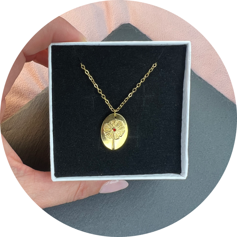 Un soffio di vento, un sogno che prende il volo. La collana Soffio cattura la magia di un desiderio espresso, con un raffinato pendente in acciaio che raffigura il fiore simbolo di speranza e nuovi inizi. Al centro, un brillante zircone rosso, custode di sogni e portafortuna, che rende ogni desiderio ancora più potente.