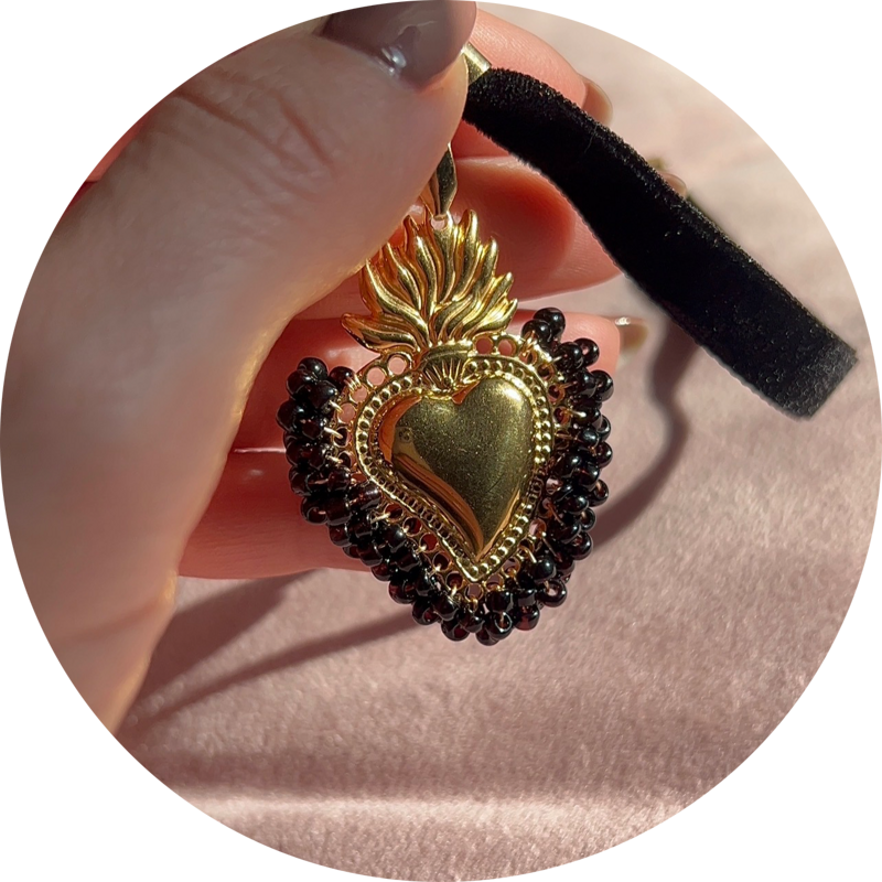 Questo ciondolo in acciaio dorato è ispirato agli ex voto tradizionali, reinterpretati in chiave contemporanea. Il cuore centrale, lucido e pieno, è incorniciato da una delicata rifinitura di perline nere che ne esalta il contrasto e il carattere deciso.
