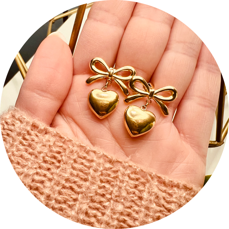 Un incanto di eleganza romantica: questi orecchini dorati combinano la delicatezza di un fiocco raffinato con la dolcezza di un cuore lucido che dondola leggero. Perfetti per illuminare ogni outfit, aggiungendo un tocco di femminilità e grazia senza tempo. Realizzati in acciaio lucido dorato.