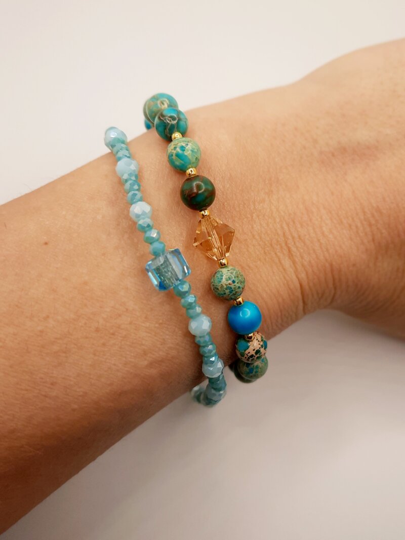 Questo set è composto da un bracciale con cristalli turchese chiaro e un bracciale elastico con pietre di diaspro col. turchese, palline in argento 925 placcate oro di mm 2 e un cristallo di mm 8 light colorado topaz.